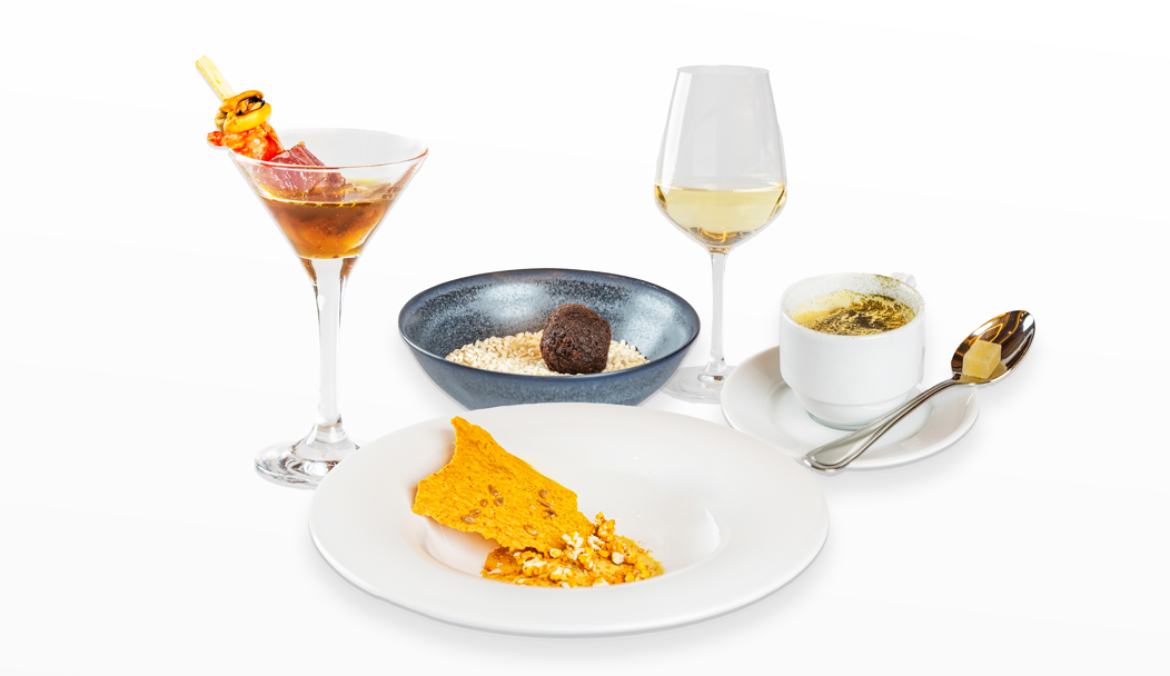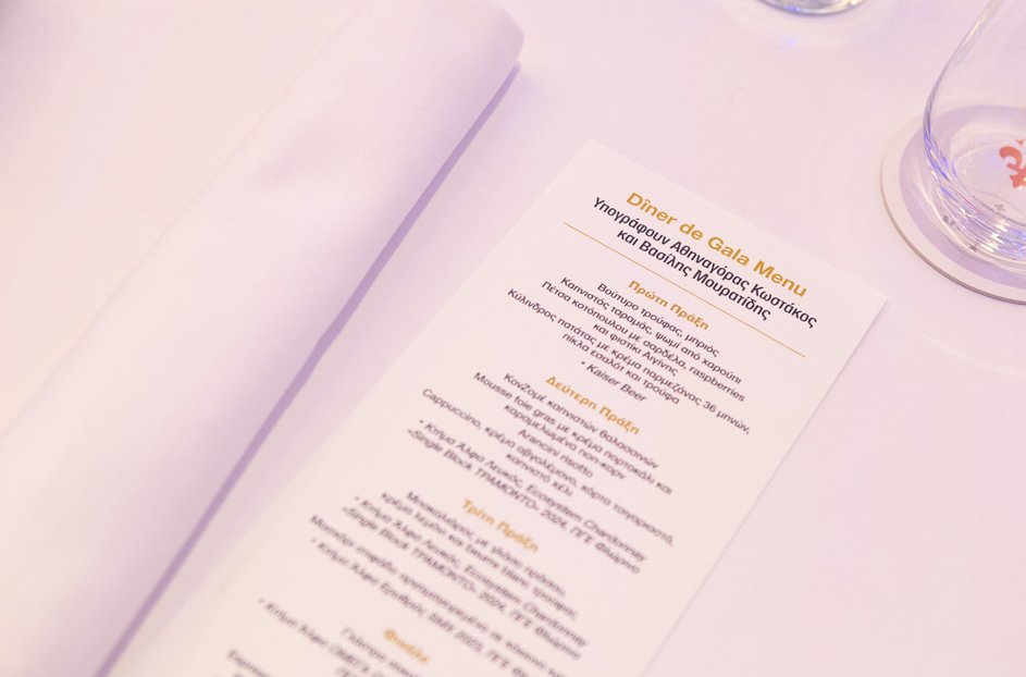 Ο καφές της βραδιάς ήταν ο εκλεκτός espresso Volluto της Nespresso Professional από την επετειακή ποικιλία 100% Arabica για τα σαράντα χρόνια της εταιρείας που πρόβαλλε πολύ ευχάριστες νότες δημητριακών και ώριμων φρούτων. Όλα τα στάδια του δείπνου συνόδευαν όπως πάντα τα premium ιταλικά νερά, ανθρακούχο φυσικό μεταλλικό S.Pellegrino από το Μπέργκαμο της Ιταλίας και φυσικό μεταλλικό Acqua Panna από την Τοσκάνη. Όσο για digestif, τι άλλο από ένα υπέροχο Negroni σε perfect serve ασφαλώς με την signature πικράδα του εμβληματικού ιταλικού bitter Campari, που έγραψε κατακόκκινους τίτλους τέλους σε μια βραδιά σαν επιτραπέζιο γαστρονομικό παιχνίδι που θα μείνει αξέχαστο σε όσους το έπαιξαν.