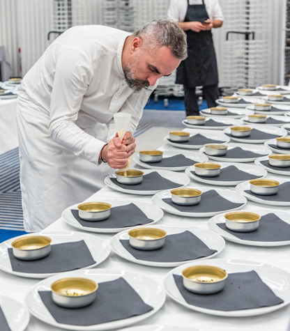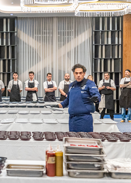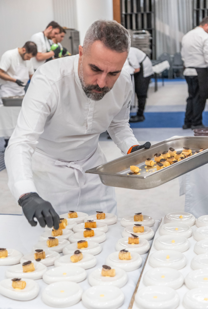 Ο Κωστάκος μας έδωσε με τη σειρά του ένα πολύ αντιπροσωπευτικό δείγμα της γενναιόδωρης ελληνικής του γεύσης που είναι αφοπλιστικά νόστιμη κι εκλεπτυσμένη, παρουσιάζοντας μοσχαρίσιο στιφάδο αργομαγειρεμένο σε κόκκινο κρασί που ήρθε έξτρα αρωματικό, με τολμηρές οξύτητες και γλυκοφάγωτα κρεμμυδάκια σαν μικρά κεχριμπάρια στο πλάι. Στο ποτήρι μας Ερυθρός SMX 2023 του Κτήματος Άλφα, ένας ιδανικός σύντροφος για πλούσια εδέσματα όπως το συγκεκριμένο. Ιδιαίτερη μνεία αξίζει επίσης στα πολύ ξεχωριστά σκεύη σερβιρίσματος της Soul Studio που ανέδειξαν με τις κομψές τους γραμμές τις εξαιρετικές σπεσιαλιτέ του δείπνου.