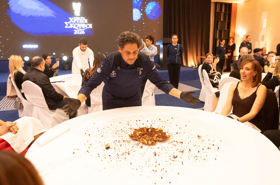 Φτάνοντας πια προς το επιδόρπιο, κανείς δεν ήξερε τι μας περίμενε όταν τα τραπέζια απογυμνώθηκαν και πάνω τους στρώθηκαν μεγάλες πλαστικές διαφάνειες. Η απάντηση ήρθε λίγο αργότερα, μόλις είδαμε μια βρώσιμη γλάστρα από σοκολάτα να προσγειώνεται με κρότο μπροστά μας και να θρυμματίζεται απολαυστικά προς κάθε κατεύθυνση του τραπεζιού προκειμένου να χαρούμε αυτήν την εξαντρίκ σύλληψη του πολύ ταλαντούχου pastry chef και στενού συνεργάτη του Κωστάκου, Σπύρου Αρτελάρη, που έκρυβε μέσα της πληθώρα από σοκολατένιες υφές, κατσικίσιο γιαούρτι κι εσπεριδοειδή και κυριολεκτικά τα έσπασε.